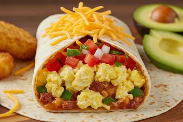 Scrambled egg, hash brown, avocado, cheddar cheese, pico de gallo, and house sauce.