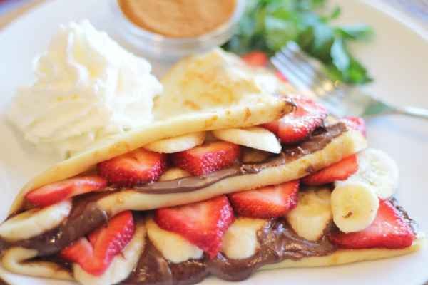 Thin, delicate crepes are filled with sliced strawberries, banana slices, and a generous spread of creamy nutella.