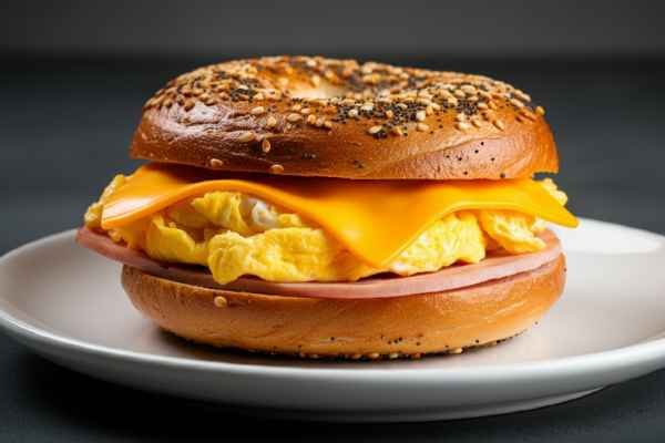 A satisfying bagel sandwich featuring crispy slices of ham, a perfectly cooked egg, and melty cheese.